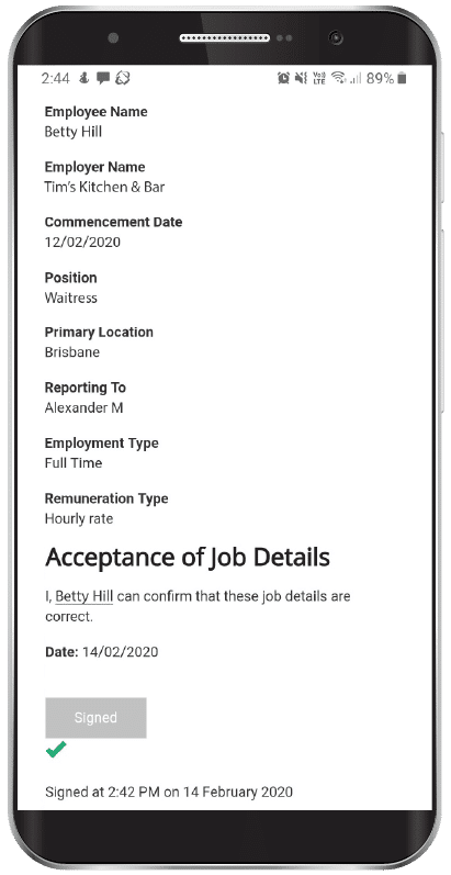 Once you’ve hired a candidate, their data automatically flows through to their employee profile in Roubler so they can onboard themselves and be ready to start work in minutes. All without any data entry or syncing data!
