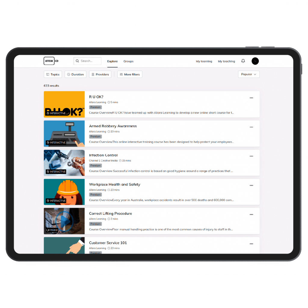 Powered by GO1, our e-learning feature lets you create your own training courses or select from thousands of ready-to-deliver courses to create custom learning pathways and certification courses relevant to your business. Employees can then complete the required training on any internet-enabled device.