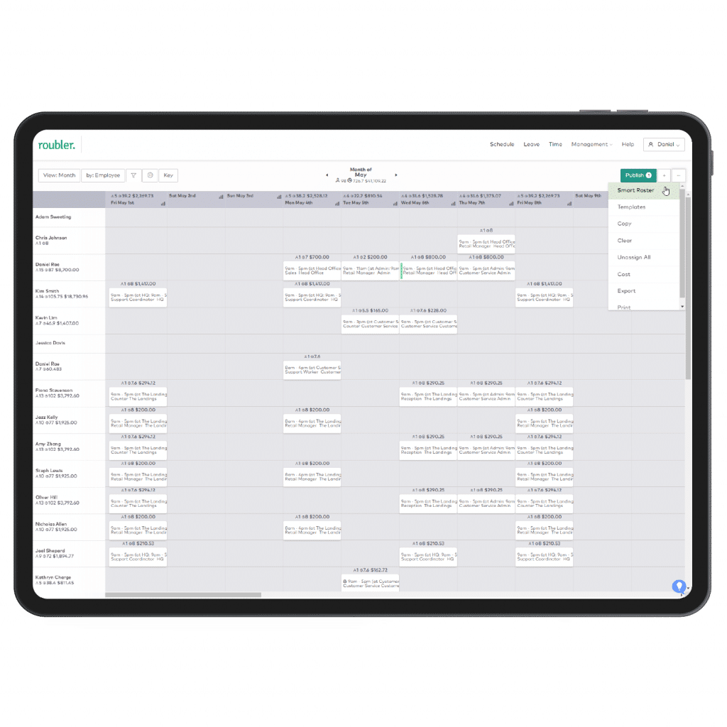 Roubler’s rostering tool then recognises staff availability for simple and easy scheduling without the need for a separate system or paper leave forms. All leave balances and payroll information is automatically updated in an instant.