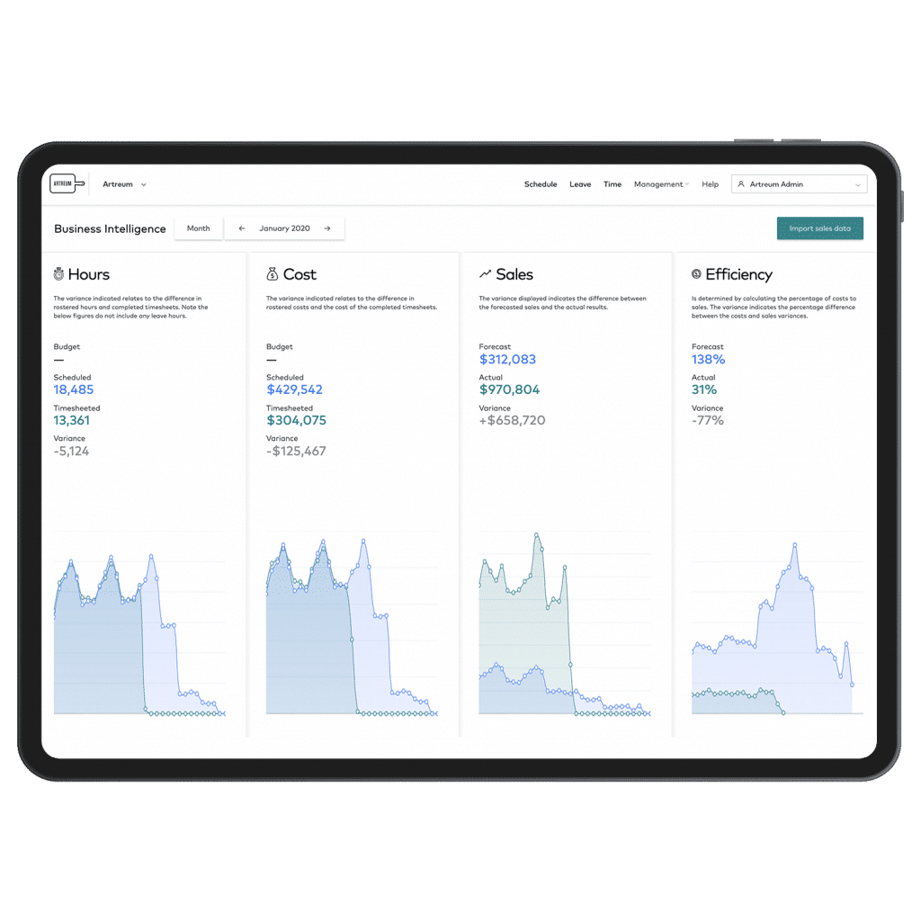 This powerful feature shows you employee costs, hours forecast vs actual hours and labour efficiency information at a glance.